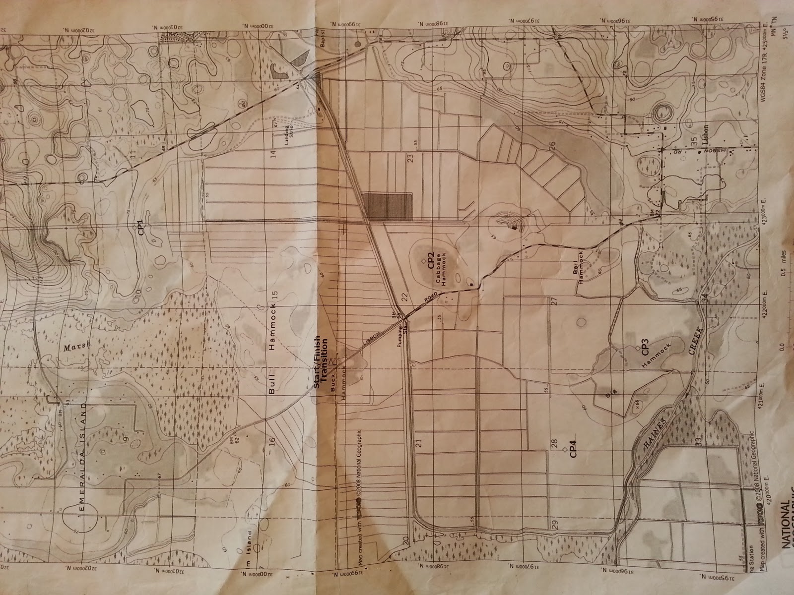 The bike back was completely uneventful, we rode by the school and found the clue War Eagles without slowing down for our last CP. The next leg was a choice of bike or trek - we chose to bike since we were in our bike shoes and ready to go. Jax had a 2 minute lead out the TA, but we caught them at the second control. We worked together through the next couple of controls until we got to CP19. They found this one quickly and headed on. We missed it by about 20 yards on our first attack and ended up spending about 15 minutes searching. I figured out our best attack at about the same time Team Mojitos came by the CP - we found it and then were on to CP20. On the way to CP20 we ran into Team Jax coming back towards us. This made no sense since they there were no controls back that way. They had not found CP20 yet - but had scoured the bike trails. This helped me decide on a conservative approach to CP20. We stopped at a T-Intersection south of the control and took a bearing through a nice deep swamp - that took us right to the CP. Team Mojitos - who had been with us at CP19 had taken a different turn on the way to CP20. As we got back to the bikes after our swamp whack to CP20 - we ran into Mojitos again. We stayed with Jax working together to finish the bike leg.